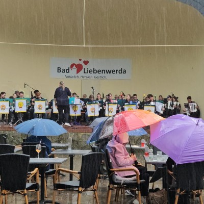 Das Sommerkonzert in der "Kleinen Blauen Maus" ist für uns eine feste Größe in jedem Jahr. Immer in den Sommerferien nehmen wir gern die Einladung an, denn hier findet sonst der wöchentliche Orchesterunterricht am Dienstag statt. Heute waren aber nicht nur die Lützner Bernis am Start. In einer etwas ungewohnten Besetzung spielten wir zunächst eine halbe Stunde unseres Konzertes. In der anschließenden Pause sahen wir den Kampfsportlern zu, die ebenfalls regelmäßig in dem Objekt trainieren. Die zweite Hälfte unseres Konzertes war der Abschluss des Nachmittages. Mit unserem Ausmarsch fielen die ersten Tropfen vom Himmel. Schnell wurden Technik und Akkordeons ausgepackt und dann hatte es sich so richtig eingeregnet. Im kleinen Festzelt kamen notgedrungen noch einmal alle zusammen und schlossen den gemeinsamen Nachmittag ab, bis sich das Wetter etwas verbesserte...