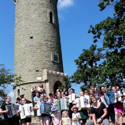 Wenn man schon einmal in der schönen Bergregion ist, so darf auch ein kleiner Wanderausflug nicht fehlen und so machten wir uns am Morgen des vierten Tages gleich nach dem Frühstück auf, um den Märchenweg in Wernigerode zu erkunden. Ziel war der Rapunzel-Turm, um ein schönes Gruppenfoto zu schießen. Natürlich hatten wir nicht bedacht, dass der Weg zum Märchenturm uns auf einen Berg führte und so waren alle fix und fertig, als sie mit ihren Akkordeons oben ankamen....doch was tut man nicht alles für ein einmaliges Foto!