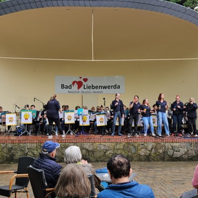 Auf uns wartete sonniges Wetter und eine große Bühne. Ein weiteres Mal konnten wir die Stücke des diesjährigen Sommerprogrammes aufführen. Besonders Spaß hatten wir am Ende des Konzertes, als das Publkum uns mit Gesang und Tanz unterstütze.
