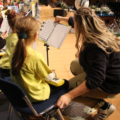 Das Jahresabschluss-Konzert bildet für alle Musikschüler und ihre Familien traditionell den Höhepunkt zum Abschluss des Jahres. Seit den Oktoberferien haben wir intensiv am Programm gearbeitet, Lieder einstudiert, fleißig geübt und die Bühnendeko gebastelt. Entsprechend aufgeregt waren alle am Konzerttag. Bereits am Vormittag war das BAO im CCL für einen Soundcheck und es gab noch einiges zu justieren und zu optimieren. Die Generalprobe lief nicht ganz reibungslos.