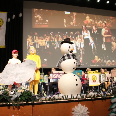 Dann war es endlich "Showtime"! Theo und Toffel begleiteten das Konzert wie immer und erlebten ein weihnachtliches Abenteuer. Dieses Jahr gab es ein großes Wunschgestöber in einer magischen Schneekugel, bei dem jedes Schütteln Theo und Toffel einen Wunsch erfüllte. Natürlich war der Weihnachtsmann nicht unbeteiligt und schaute ebenfalls beim Konzert vorbei. Die Geschichte wurde musikalisch von den Musikunde-Kindern, den Melodika-Kids, den Akkordeonzwergen, den Junior-Bernis und den Akkordeonspielern der Musikschule Fröhlich unter der Leitung von Susann Kage umrahmt.